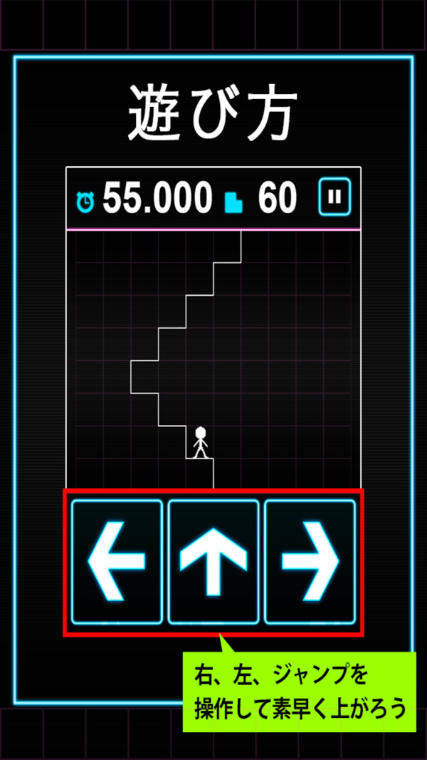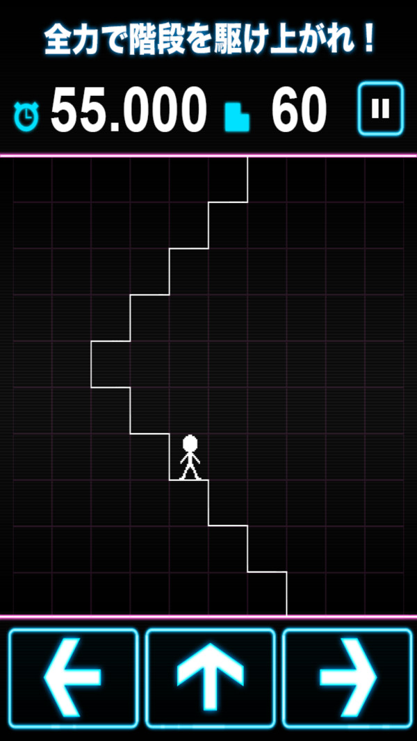 非常简单,就是控制火柴人爬楼梯,用最快的速度爬上100阶,