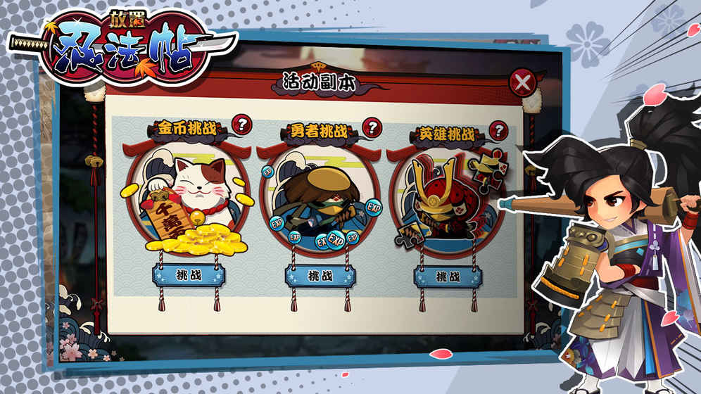 放置忍法帖是一款放置挂机类卡牌手游。唯美可爱的游戏场景,卡通Q萌的人物角色形象,多种副本挑战,每日在线豪礼送送送!在线即领奖励,赶快预约走起吧!