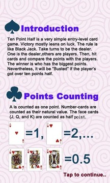 《十点半 10.5》是一个非常简单的入门级纸牌游戏,,胜负以运气成份居多,有点类似二十一点的玩法,好牌的点数十点半刚好是二十一点的一半所以名称叫做十点半.规则非常简单,轮流做庄,一家是庄家,其他家是閒家,补牌比大小,点数大者获胜,但超过10点半,即为爆牌(Busted)判输.