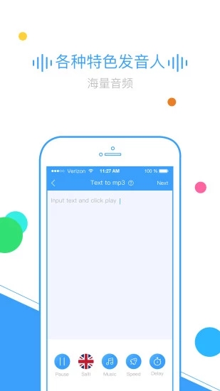 第二步:手机打开Text To Mp3,将需要语音合成的文本输入到编辑框内,根据自己的实际需求,选择需要合成的语言及发音人,(如果你想合成英语,请选择英语的发音人)调节语速快慢,然后点击试听,觉得满意之后,单击右上角的“下一步”按钮转到高级设置页面。