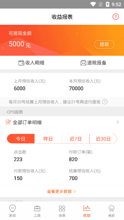 可生成的今日、昨日、七日、三十日的收入,支持切换!