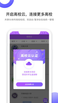 开启高校云,连接更多高校:共享50余所高校校招,双选会/宣讲会在线统一管理