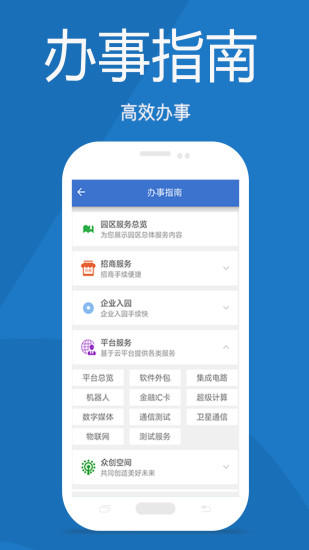 办事指南:服务总览、招商服务、企业入园、人才服务、众创空间、平台服务、金融服务等全方位的指南