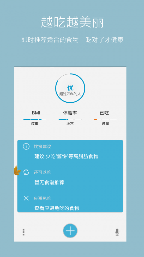好好吃饭是一款日常健康保驾护航的软件平台,好好吃饭营养师为减肥人群定制的营养食谱,快手易操作,越吃越健康,瘦身达人聚集地,分享励志故事、减肥心得,和小伙伴一起,想不瘦都难好好吃饭能够实时为您分析您当前的饮食营养状况,并实时提供适合食物 提醒可能遇到的不良现象,为您的日常健康保驾护航减肥,增肌,保养,均有一体化解决方案,让您健康美丽的同时达到目标。智能监测模型,能自动分析您吃的食物是否过量16钟营养即时监控,满足您日常营养状况的需求三百种不良状况实时提醒,切实做到“”治未病,吃出健康美的理念“”