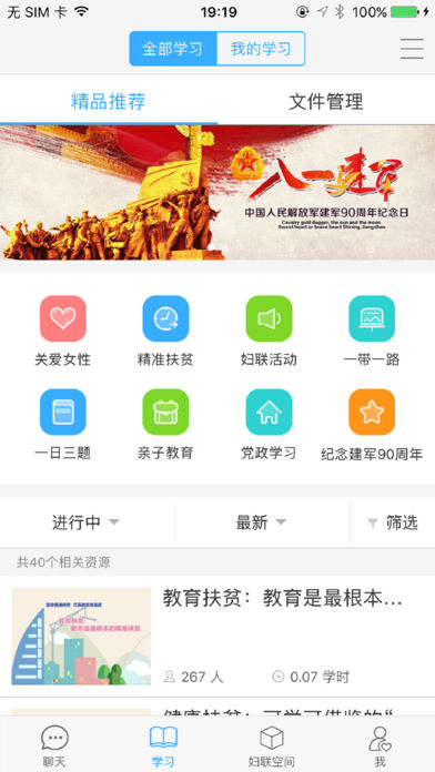 点击“学习空间”:进入视频观看列表,按照分类划分内容,包括:关爱女性、精准扶贫、妇联活动、亲子教育、党政学习等多个板块。