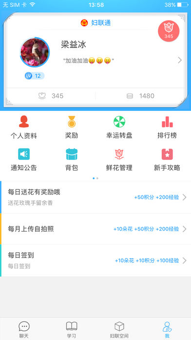 送花:每日向三个好友或陌生用户送上小花,即可获得200经验,50积分。