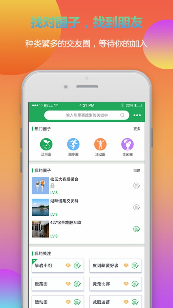 热门话题--看哪里,就带你去那里;悬赏--展现自己才华还能获得红包奖励;不懂也能问,总有人能帮到你;圈子--开放圈子:圈子让你找到组织,跟组织一起奔跑;私密圈子:亲朋好友在 一起,共同运动,共享健康;运动--全方位记录和分析您的运动数据,让健康提升看得见;商城--专业的运动设备,呵护您和家人的运动,价格超值,还能抽奖和兑换。?关爱家人就关爱他的每一步关心朋友就关心他的健康健康从来不是一个人的事,从今天起我们一起呵护健康,一起年轻美丽