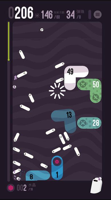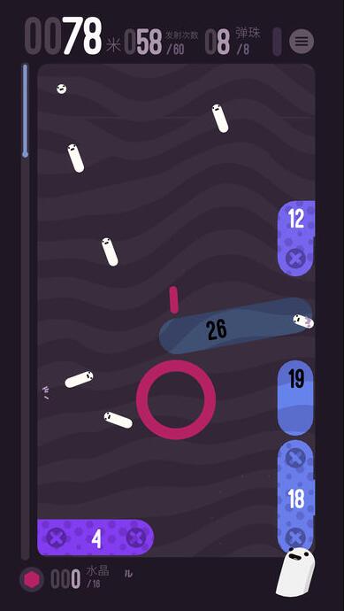 在游戏中玩家可以通过弹射击落各种形状的方块来获得得分,你需要利用每个回合有限的发射次数,精心策划并制定战略来射击固定在墙上的一些障碍物,以最大效果为目标进行射击。在尽可能多地击落障碍物的同时,收集用于升级的水晶,并越来越深入地表以下。
