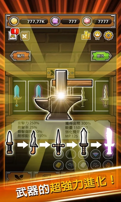 你打造的武器就像拥有生命一样自由行动与战斗。无聊吗?那现在就试着成为最顶尖名剑的主人吧!担心会太复杂吗?请别担心!打造最强名剑是完全不需要教学的简单放置型游戏!另外,打造最强名剑不同于一般放置型游戏无趣的战斗方式,以动态与刺激的战斗为傲。使用华丽与强大的技能消灭敌人,释放压力吧!是否已经找到无聊时值得一玩的游戏呢?若是还没找到,打造最强名剑会是最好的选择!
