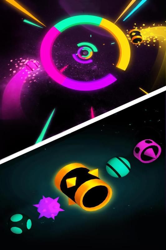 穿过对应颜色的机关障碍,躲避与小球颜色不同的阻碍,或穿梭空白区域;