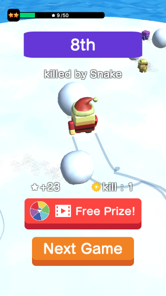 游戏中玩家需要将雪球越滚越大,将其它玩家击到水中就可以获得多的星星,星星可以用来解锁好看的人物皮肤,操作其实不难,主要是不能让别人推下去,蛮有趣,易上瘾的操作。