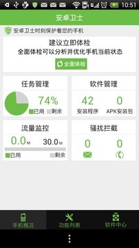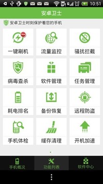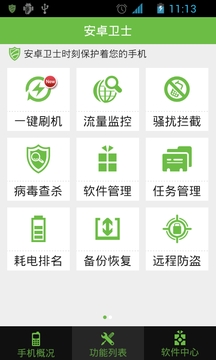 安卓卫士时刻保护您的手机 安卓卫士是一款基于android系统的安全防护、系统优化管理软件产品拥有稳定性高、占用系统资源少、相关数据统计精细准确等特点,以病毒云查杀、网络流量监控、垃圾短信及骚扰来电智能拦截为核心功能,并包括:系统检测、缓存清理、开机加速、防火墙、备份恢复、远程防盗、软件管理、进程管理、耗电排名等功能