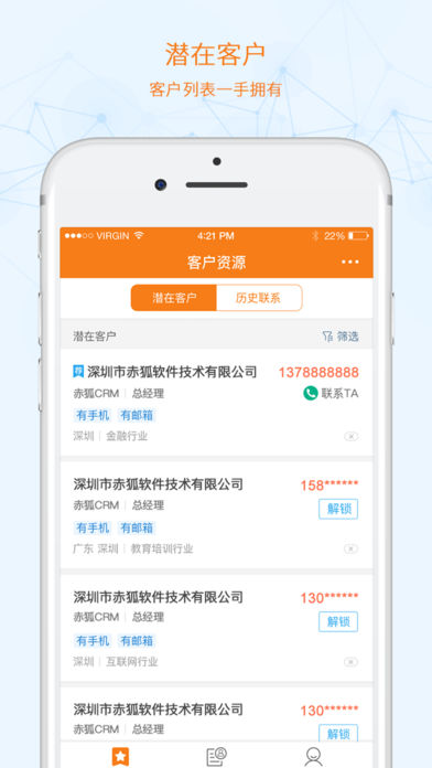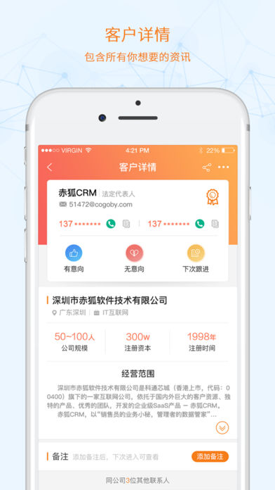 赤狐app是一款非常有特色的客户关系管理应用,是一个可以帮你找客户的CRM软件。赤狐app结合PC端页面可以进行非常好用的客户挖掘、客户管理,大大提高乐工作效率,欢迎各位下载使用。