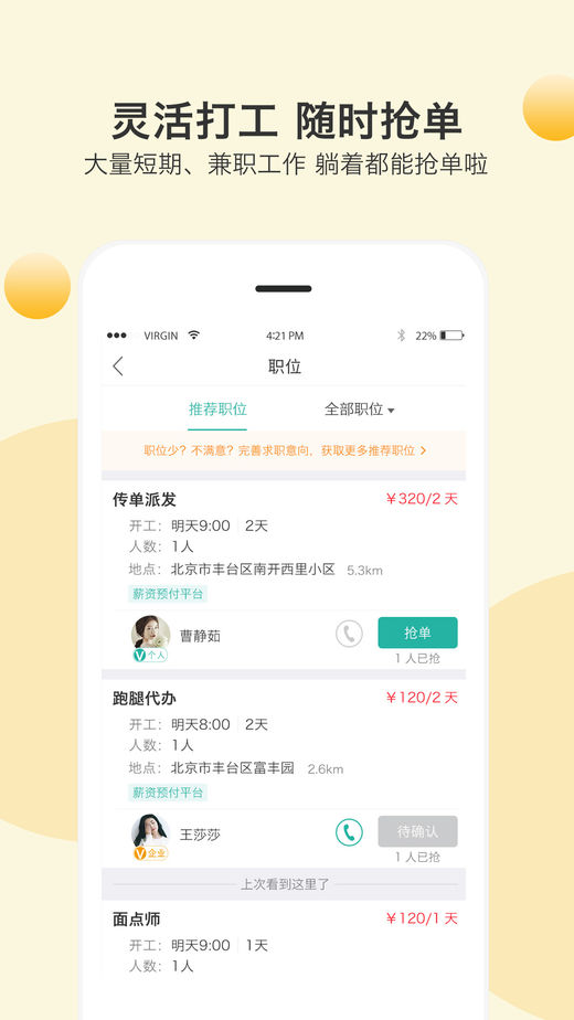 陌上花开:老用户了,宝妈一枚时间比较琐碎,想找灵活的工作,一秒招聘满足了我的工作需求。