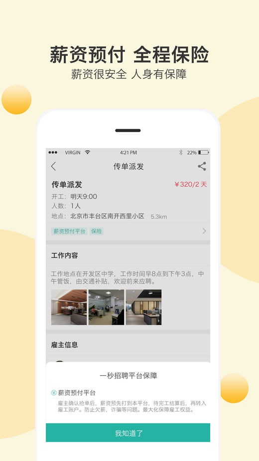 诚信安全可靠:订单完成,雇主即通过平台 向雇员支付劳动报酬,杜绝不诚信的欠薪。通过商业保险为雇员提供保障,被“风投”大咖誉为“滴滴打工”。