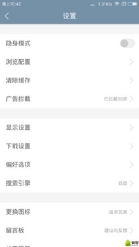 小巧:体积只有1M。精美:沉浸式浏览;滑动导航;魔法变色。强大:支持广告可视化标记;广告拦截;智能无图;隐身浏览;夜间模式;文艺模式;自定义下载器;多窗口;自动MiniBar;扩展插件;超强搜索引擎提示;自定义搜索插件;自定义UA;防追踪;弹窗拦截;更换图标;手势自定义等多种特性。任性:一个人开发。