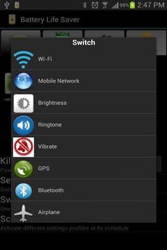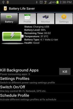 AMS电池救生圈使您担心您的手机电池寿命!它也可以促进自由内存到你的移动电话。试试这个软件免费好几天。你应该得到一个长时间的电池!甚至没有必要一抽头优化器。电池寿命应用程序将会自动杀死保持运行在背景不必要和消耗电池和处理能力(optionals设置)。电池救生圈给你优质开/关开关,您可以使用快速开关开启/关闭某些功能节省电池寿命。电池救生圈是有内置电池保存配置文件。你也可以创建你自己的电池储蓄概要文件。一个电池保存配置文件是一组设置打开或关闭某些功能——一次。电池救生圈允许你激活某些电池保存概要文件在修复计划。例如你可以安排一个电池保存概要文件被激活,当你去睡觉在晚上。电池都有一个特殊的救生圈电池保存概要文件被称为睡眠。这个概要文件关闭一切除了时钟程序(早上报警)。所以很少的电池电源时使用这个电池保存概要文件被激活。你可以激活这个电池保存概要文件在晚上当你去睡觉。你可以设置闹钟时间的早晨,当你想禁用睡眠剖面和开关回到最近的剖面。电池救生圈还监视你的电话要注意,哪些应用程序或电话功能消耗大部分的电池和处理能力。电池救生圈还报告,哪些应用程序消耗大部分液晶显示时间,wi - fi和3 g / 4 g网络。电池剩余电池救生圈显示在状态栏通知/,它也告诉你,多长时间你的电池可以持续没有充电。当你开始给手机充电,电池救生圈显示将要花多少时间完全充电电池。电池救生圈也可以提醒你当剩余电池功率低于限制,你可以设置。电池可以在救生圈后语言:英语,德语,西班牙语,法语,意大利语,日语,俄语,韩语,中文(简体)电池寿命保护应用程序有一个选项来联系客户支持。请使用这个选项如果你需要帮助。
