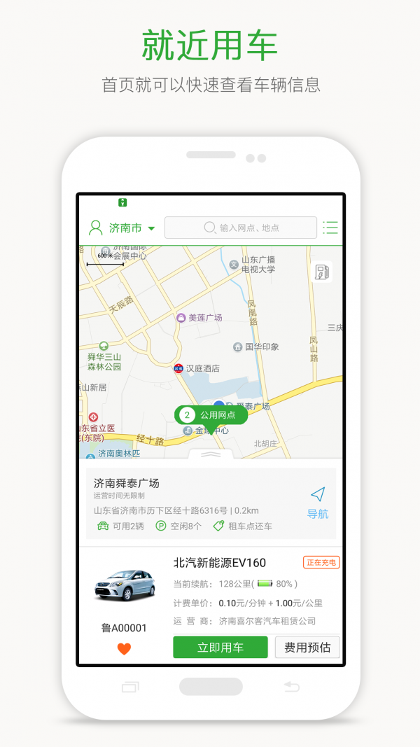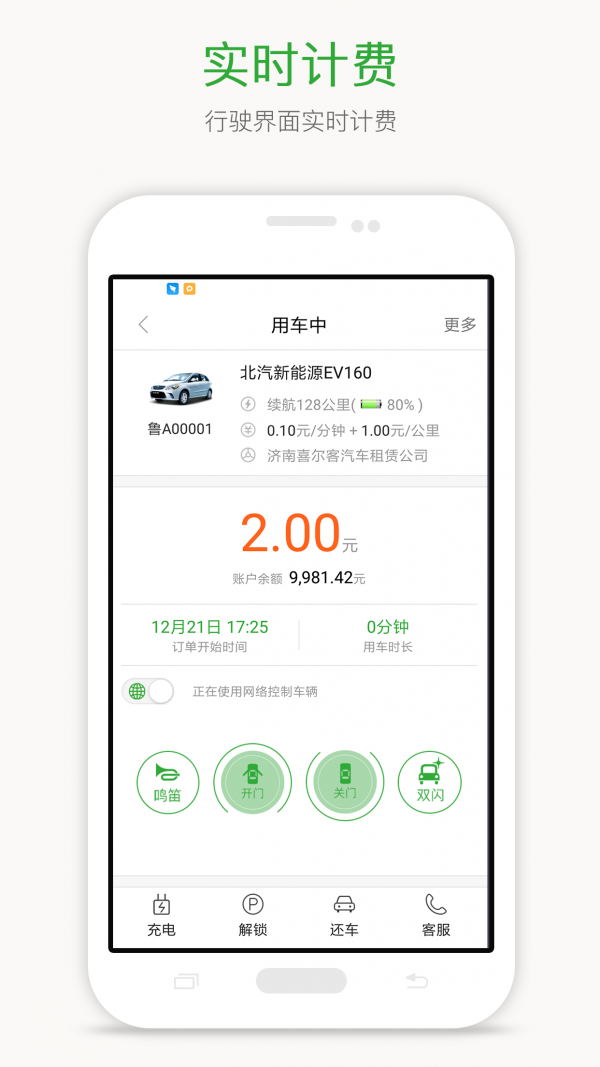 您可以随时随地通过手机搜索附近网点的车辆,取车、用车、还车,自助完成订单,按分钟计费,计价更合理。绿色出行,一触即发。
