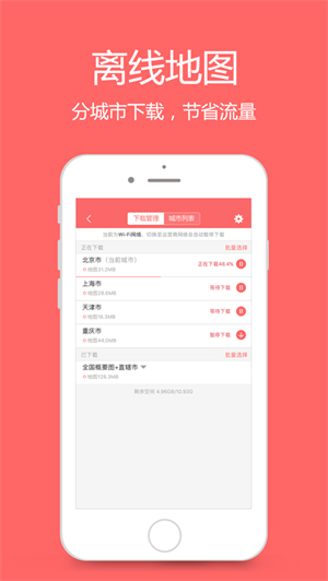 - 离线地图覆盖全国省市,支持分城市的数据下载。