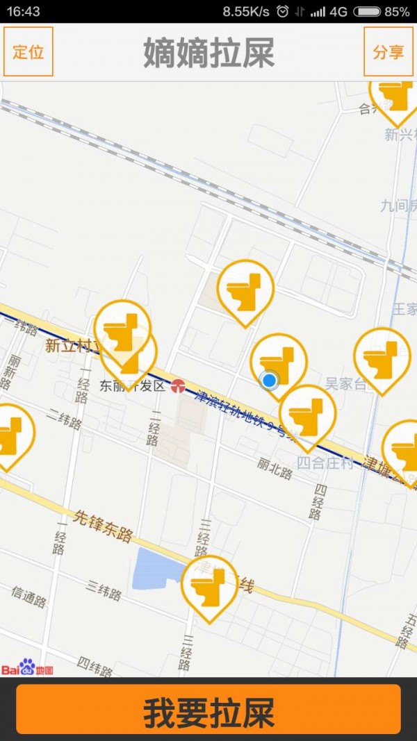 嫡嫡拉屎app是一个可快速找到附近厕所的手机应用,有了嫡嫡拉屎app,妈妈再也不用担心我找不到厕所啦!嫡嫡一下,找到最近的厕所!