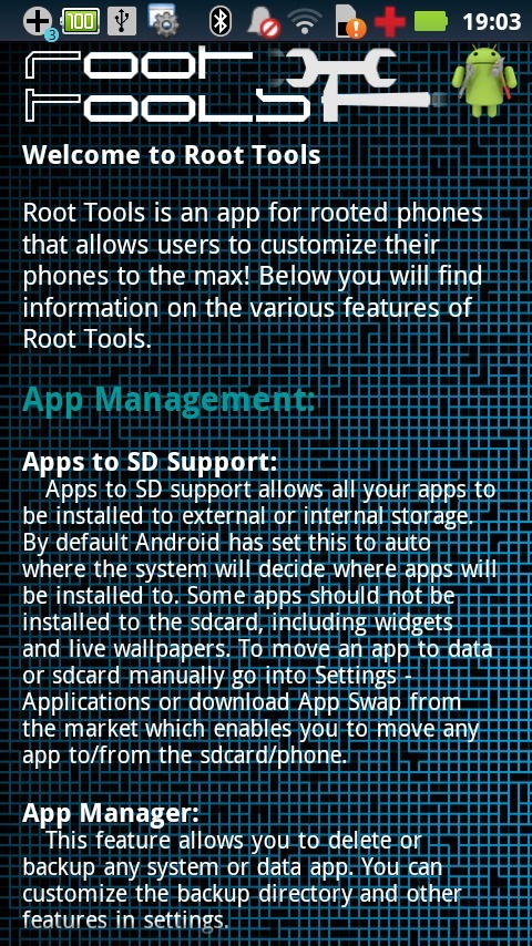 Root Tools是一款Android ROOT根权限的必备工具,实在是Android资深玩家定制系统和Android开发者修改程序的终极工具。Root Tools能够最大限度的定制你的Android系统,你能够随意改变系统的字体和开机动画,而删除系统或软件数据也将变得易如反掌。这款软件的主要功能分为以下几部分!应用管理:- Android 2.2及以上支持将应用安装到SD卡;- 备份或者回复任何系统或应用的数据;- 删除任何系统或应用的数据;- 支持批量删除和备份。Goodie的附加组件:- 最多支持30个开机动画列表;- 开机的时候可以随机播放开机动画列表中的动画;- 支持超过25种以上的自定义字体;- 下拉文本编辑器。系统调整功能:- 阻止广告;- 属性编辑功能:减少呼叫震动和铃声的时间,以节省电池电量;Dalvik虚拟机以提高系统性能;设置活动进程的延迟;管理stagefright player;设置无线信号的扫描时间间隔,以节省电量;更改你的屏幕分辨率;- 管理缓存:清除内部存储器或者SD卡上所有的缓存;可以将高速缓存文件从内部存储移动到SD卡或者反过来;