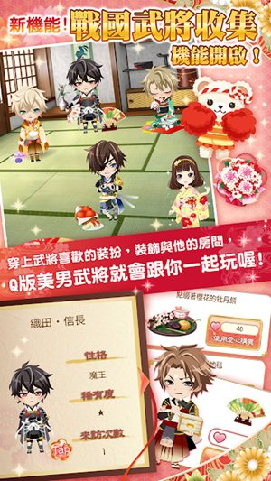 糖心数位和Cybird合作,代理由他们开发的恋爱游戏《美男战国·穿越时空之恋》的中文版本,本作曾经在去年6月登陆日本市场,是一款以日本战国为背景的女性向恋爱游戏。玩家在游戏中扮演意外穿越到日本战国的现代女性,阴差阳错的救下了遭遇本能寺之变的织田信长。游戏中共有11为知名武将可以攻略,除了攻略这些知名的日本武将之外,玩家还可以自由布置自己的房间,并未自己换上不同的风格的服装和道具。