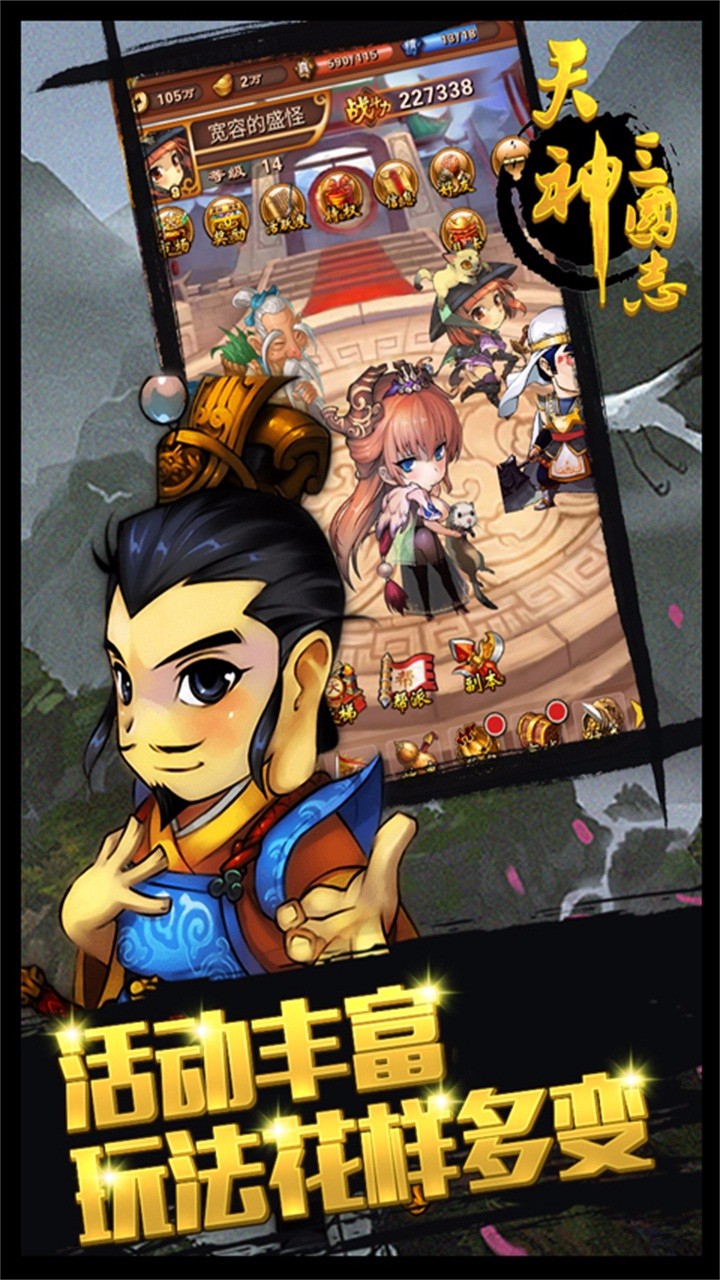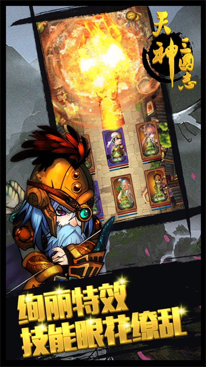 《天神三国志》以丰富多变的战斗体验、超精美的卡牌、大师级的画面表现以及极富策略性的玩法带领玩家重回烽火连天的三国,山河破碎,等待你来拯救。