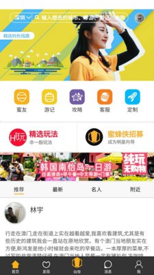 蜜蜂向导是一款全球目的地预约向导服务的社交类旅游工具。在这里,您可以体验与全球向导在线交流、游记分享、紧急定位求助、实时在线购买产品等细节服务。参与设计与开发人员中都是具有旅游行业多年经验的资深专家,我们会希望能够为更多的自助旅游爱好者提供千变万化的旅游乐趣体验。