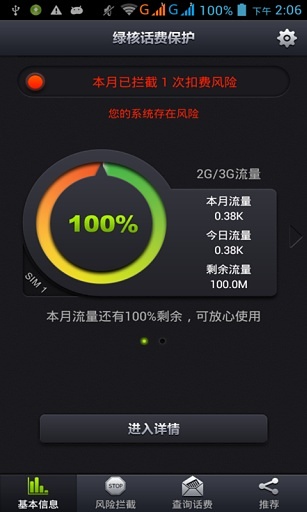 安卓手机经常被偷偷扣费,不要着急,让话费保护来帮你解决,话费保护是一款保护手机不被恶意扣费的软件,从四个方面保护你的手机安全:1、监控:对手机联网、短信发送、拨打电话的行为进行全面监控;2、拦截:对所有存在计费风险的操作进行拦截;3、统计:对手机联网、短信发送、拨打电话的操作进行全面统计;4、追溯:对每台手机的计费操作进行程序追溯,找到吸费软件