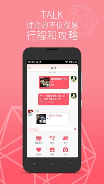 -出门旅行,你还是上网搜索游记和攻略;然后用qq和微信来讨论如何规划自己的行程么?你OUT了,有桃子旅行就够了~-跟闺蜜分享好玩地,讨论攻略,不用再按来按去,超简单操作~用过才知道~三大核心功能:【Talk】-和闺蜜一起讨论,出游计划一起做~-拉开聊天抽屉,计划、攻略、景点、收藏,神马都有~【旅程规划】·自动生成推荐路线,省心又方便~景点路线随时自由添加、调整,说变就变~·超方便收集当地吃吃吃、买买买小店~不用再错过【身边发现】-说走就走,先出发,到了再看身边的吃、玩、买、住~