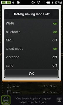 当手机电量不足时,用户只需点击省电按钮即可开启省电模式,启动省电模式后以下内容关闭:关闭WIFI、蓝牙、GPS定位、背景灯,手机调至静音、震动模式关闭、同步关闭。可通过"设置"按钮,自定义关闭内容。