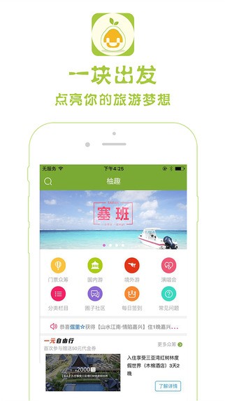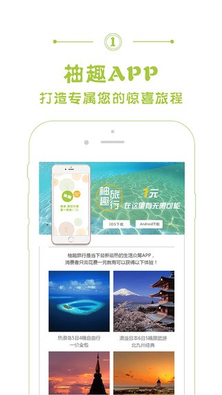 柚趣,是一款基于移动终端的旅行度假商品众筹平台,为您提供自由行、当地游、周边游、国内游、出境游等精选旅游产品。柚趣引入了当下互联网的新概念,众筹。每个用户最低只需1元就有机会获得一次旅行机会,奖品均为国内外的旅游路线产品。