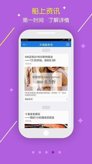 1.可以查看船上各种活动的时间信息,知晓航线的进展和目的地天气,了解收费餐厅的预订情况。2.演出、娱乐、户外活动,天海邮轮为船上游客提供了琳琅满目的选择,在APP的智能设置下,您如同有了智能管家,只要预订好您想要参加的活动,打开APP,就可以在“日程”下面轻松查看自己的一天。3.在天海邮轮的APP上,最有价值的就是您可以通过手机联络人,迅速找到自己同行的亲朋好友,相互如微信功能般加为好友,彼此享受船上免费通话。4.除了亲朋好友,天海提供的各类船上活动,都可结识到志同道合的朋友。5.相互用天海微信摇一摇,彼此就可以享受旅途中的免费沟通,随时联络的自由,还可以一起约一场海上高尔夫,或者在天海ktv唱响中国好声音。6.APP上最受关注的功能可谓免税购物和经典行程两个区域。7.天海邮轮的免税购物店,是品种最繁多、优惠最给力的邮轮免税店。8.随着每个航次的不同,推出应季应景的优惠大礼包等品牌产品。9.Burberry、Armani、Gucci…….深受中国消费者喜爱的国际品牌,在天海邮轮上都会不定期推出自己的优惠。