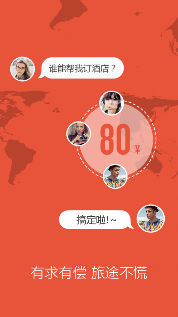 app是一款旅游求助互助类手机应用,用户可以在app发布悬赏求助,解决旅途中的疑惑和麻烦;也可以通过参加求助帮助别人,得到回馈的赏金;或者是分享你旅途中的见闻和风景,化作一张张的明信片飞向远方。