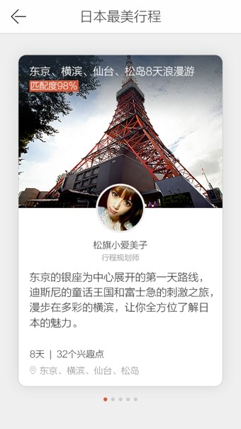 游谱中最有特色的是行程规划师的角色,Ta会按照你的旅行设置制定最适合你的行程,再也不用在茫茫的游记大海中找兴趣点了。在行程详情的首页,你可以查看本次行程的简单介绍,人均价格和游玩城市一目了然。你还可以在这里咨询行程规划师,他会根据你对行程的修改需求帮助你修改,一个更加满足用户个性化需求的行程会在三个工作日内更新到你的个人主页中。