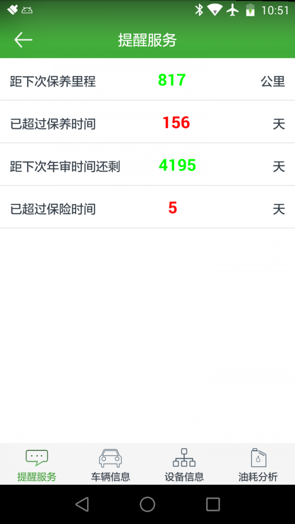 1、我的爱车:使用此模块可实现离下次保养里程数提醒、离下次年审剩余天数提醒。