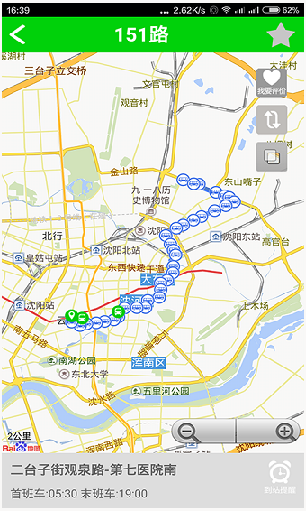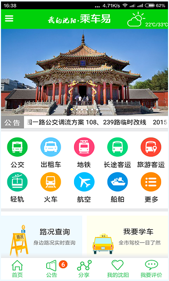 1.公交车到站时间一目了然(1)我要去哪:用户可查询指定起点、终点间的公交线路及出行方案。根据起止点位置可查询公交线路即将到达指定站点的最近车辆位置,并根据实时公交位置信息对到站时间进行估算。(2)周边公交:直观体现了线路的上行、下行,用户点击详情便能看到当前车辆的到站距离及到达时间。以列表的形式直观展现用户所在位置的公交线路名称、线路的起点及终点、最近站点及到达距离、首末时间等以供参考选择。(3)搜索公交:用户可查询任意一条沈阳公交线路的站点名称、以及距离起点位置最近的站点、到达距离等。(4)收藏公交:用户可以添加自己常用的公交线路。(5)到站提醒:选择目的地站点,开启到站提醒功能。(6)公交助手:包含“公交充值点查询”、“公交公司查询”、“公交指南”、“IC卡管理规定”四部分。(7)评价:市民可根据司机的行为举止、服务态度点“赞”或点“踩”,也可将投诉建议以文字形式反馈,相关部门会在调查后予以回复。2.陆海空信息一手掌控,车票手机轻松订在“我的沈阳、乘车易”手机APP中点击“长途客运”,输入目的地城市,即可查询始发客运站的位置、电话信息,以及客车类型、发车时间,全程距离和票价。除此之外,旅游包车、长途客运网上订票、客运站信息与长途线路、票价、发车时刻表也一目了然。为更好的服务百姓出行,“乘车易”还将链接地铁、轻轨、铁路、航班、船舶的查询网址,市民可直接在APP中查询到更多出行方式的详细信息,并可实现手机购票。另外,点击“出租汽车”输入所要查询的出租车公司名称,即可搜索查看其公司的地址、电话及联系人等详细信息;输入出租车牌号,即可查询该车所属公司名称及相关负责人信息。重要的是,市民在日常乘坐出租车时,可以给司机点“赞”或点“踩”,也可将投诉建议进行反馈。3.犹如生活百宝箱,衣食住行样样全 “乘车易”将即时发布最新路况信息、公交调流信息等公告。例如:由于修路导致的道路变更、公交改线以及恶劣天气造成的封路等信息。除此之外,路况查询、驾校查询、车辆维修企业查询、违章查询、停车场、加油站、4S店查询、驾驶证、行车证 件 办理查询等都可一键搞定。此平台不仅为市民提供实时、准确、便捷的公众出行等综合信息服务,还贴心的将购物、影院订票、美食团购、酒店预约、周边旅游、身边超市等生活信息也囊括进来,为您提供衣食住行全方位服务。