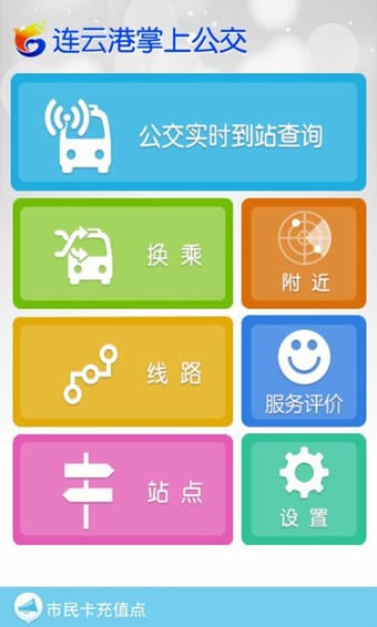1.线路:提供公交线路的查询;2.换乘:提供连云港公交的换乘方案参考;3.站点:提供按站点查询经过线路的查询;4.公交实时到站查询:提供连云港的实时公交线路和到站查询;5.附近:提供附近POI信息点的查询搜索和市民一卡通相关信息查询。