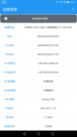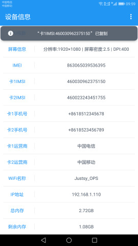 1、查看设备的系统版本、设备厂商、设备型号、ROM版本、IMEI、IMSI、WIFI名称、IP地址、总内存和剩余内存等信息