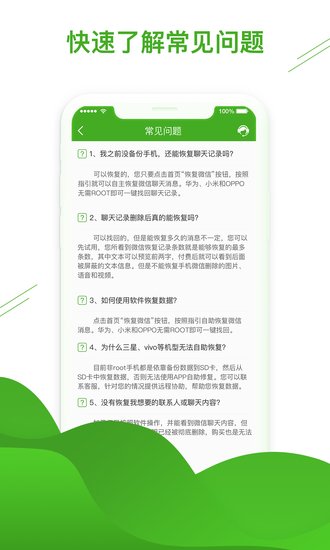 简单好用,微信聊天记录恢复无需电脑配合,直接在手机上即可恢复微信聊天记录,误删的微信聊天记录扫描后直接在App内预览查看,无需专业人员指导,傻瓜式操作,一键扫描即可找回误删微信聊天记录;