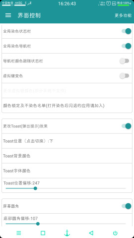9、界面控制,类似PCB(perfectcolorbar),可以让应用状态栏和导航栏变色(自动取色),可以更改toast样式,可设置屏幕圆角。