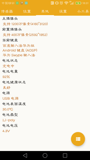 信息查看:查看硬件信息,系统信息,安装软件信息,媒体信息,网络信息,传感器信息,GPS定位信息,地区与时间,电源信息,系统设置