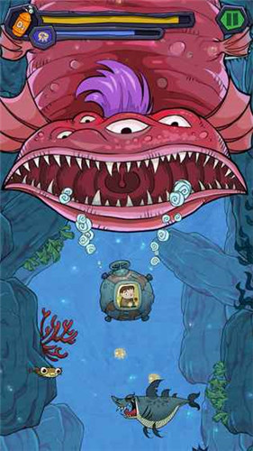 玩家用手指滑动屏幕,来控制潜艇的方向,在深海中进行探险,在探险的过程中会遇到各种敌人、陷阱,避开它们同时解救更多的精灵,获得更多的钻石,开启更多的水域。