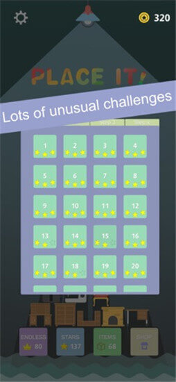 《place it》是一款有趣好玩的休闲物理闯关手游,很考验玩家对于重力趋势预测能力,游戏画面很精致,玩法有点虐心,既能体验到堆箱子的经典,又能挑战堆家具更难的玩法,还可以挑战无尽模式,让你金币赚个够,在玩的时候要注意用到物理知识,要盘对重力影响,不能倒了,是打发时间的很好的选择,在闲暇之余随时随打来一局,是很不错的。快来下载place it吧。