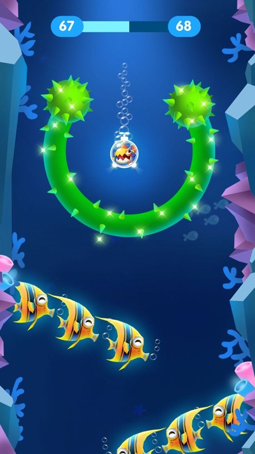 3、点击屏幕按住不放,让小鱼向下穿过机关,松开手小鱼就会向上游。