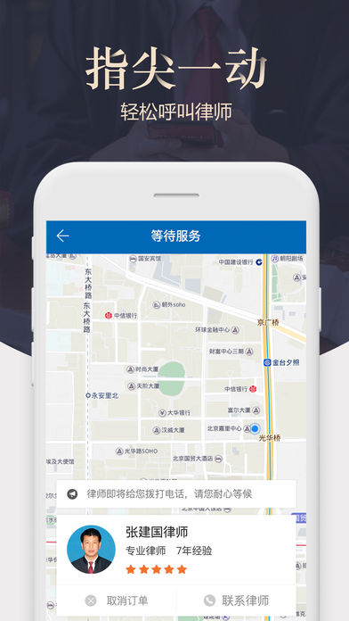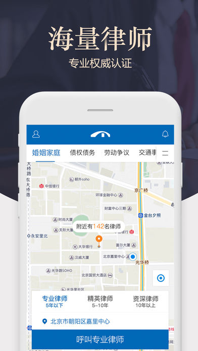 轻触按键,律师解答。您只需选择案件类型和律师年限,一键呼叫周围律师,随时随地享受移动互联网法律的便捷。