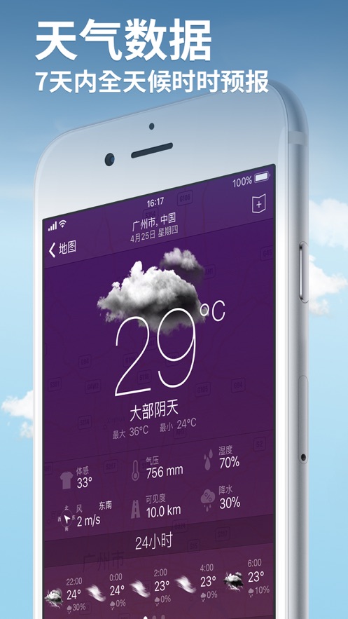 * 雷达和天气叠加图可以高清和逼真色彩显示实时雨量、雪量、混合降水量以及云量。