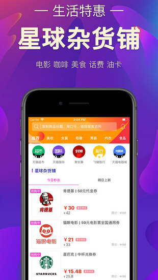 >星球杂货铺每天上线品牌(星巴克、肯德基、加油卡等)折扣券,线下知名品牌均有合作