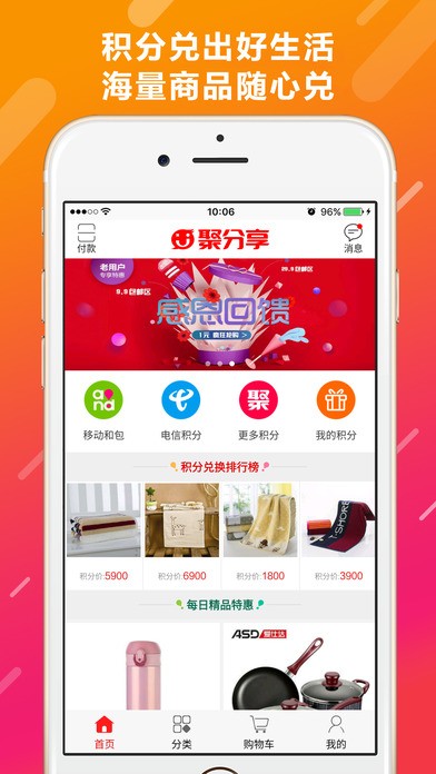 你有好多积分,单个不够用,放着好浪费。聚分享商城app现已与多渠道积分实现系统对接。动一动手指,您的各类积分即可与聚分享积分实现互兑。您可凭积分轻松兑换平台商城内上万款商品,同时支持线下上百家品牌店铺积分消费。聚分享,帮您聚积分、兑积分,轻松消费,是您必备的积分好伙伴!