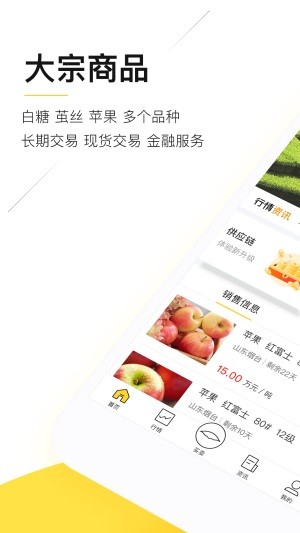 app专注于农产品B2B垂直领域,搭建白糖、茧丝、苹果多个品类的大宗综合交易平台,为产业上下游的生产者、加工企业、供应商、终端商等提供多元化交易、专业及时的信息资讯、第三方智能仓储、多式联运物流配送、定制化供应链金融、技术支持等综合服务。